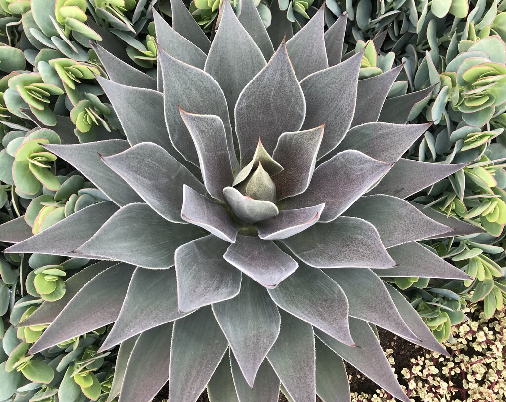 Smokey purple leaves are broad with tiny white spines. 'Lavender Lady' has a well-rounded, geometric form capable of thrilling in a decorative or mixed container, or standing alone as a landscape specimen.