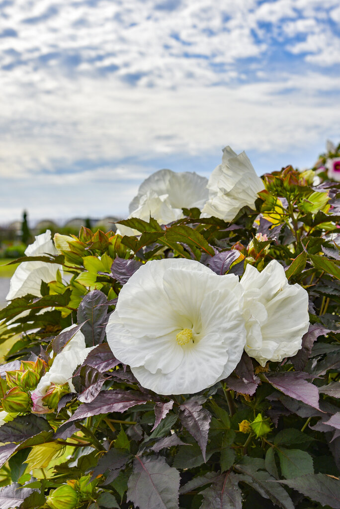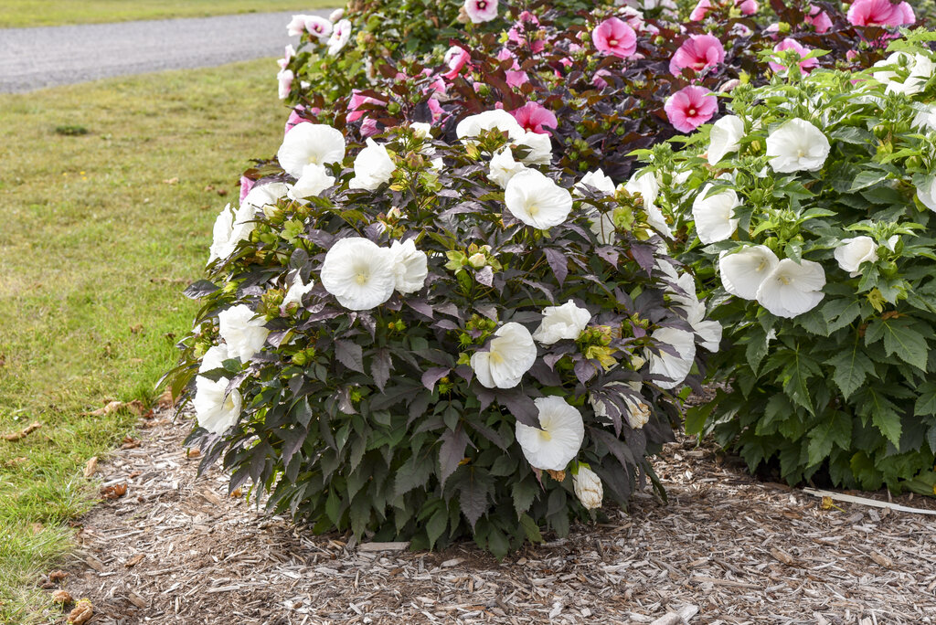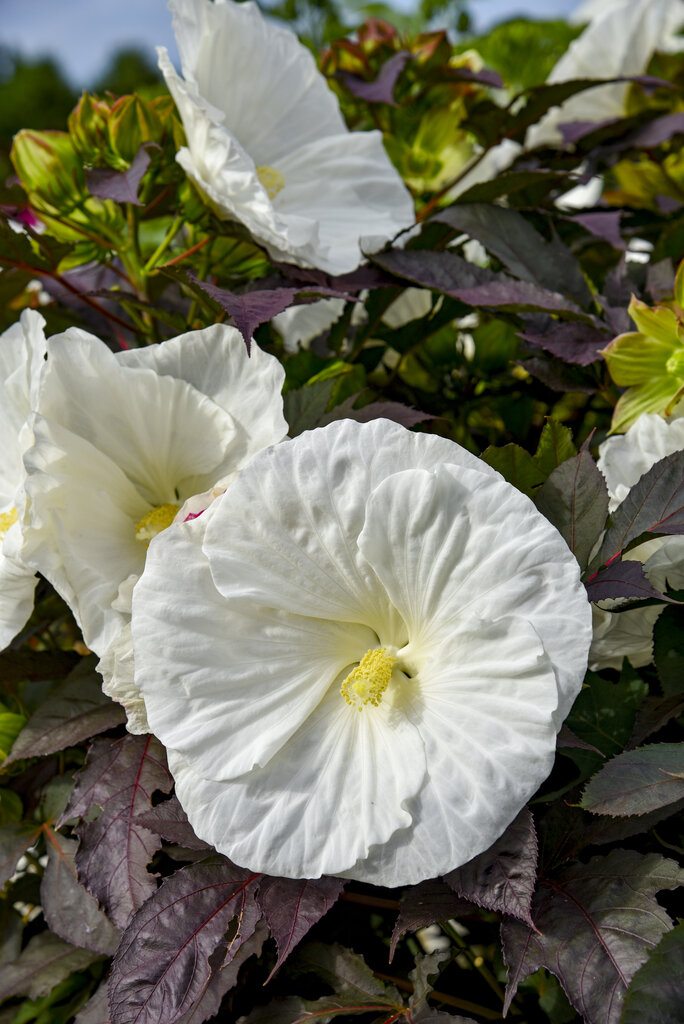 A night and day combination of matte black foliage and pure white flowers. Like other dark-leaved Hardy Hibiscus, full sun is necessary to bring out the deepest foliage color.
