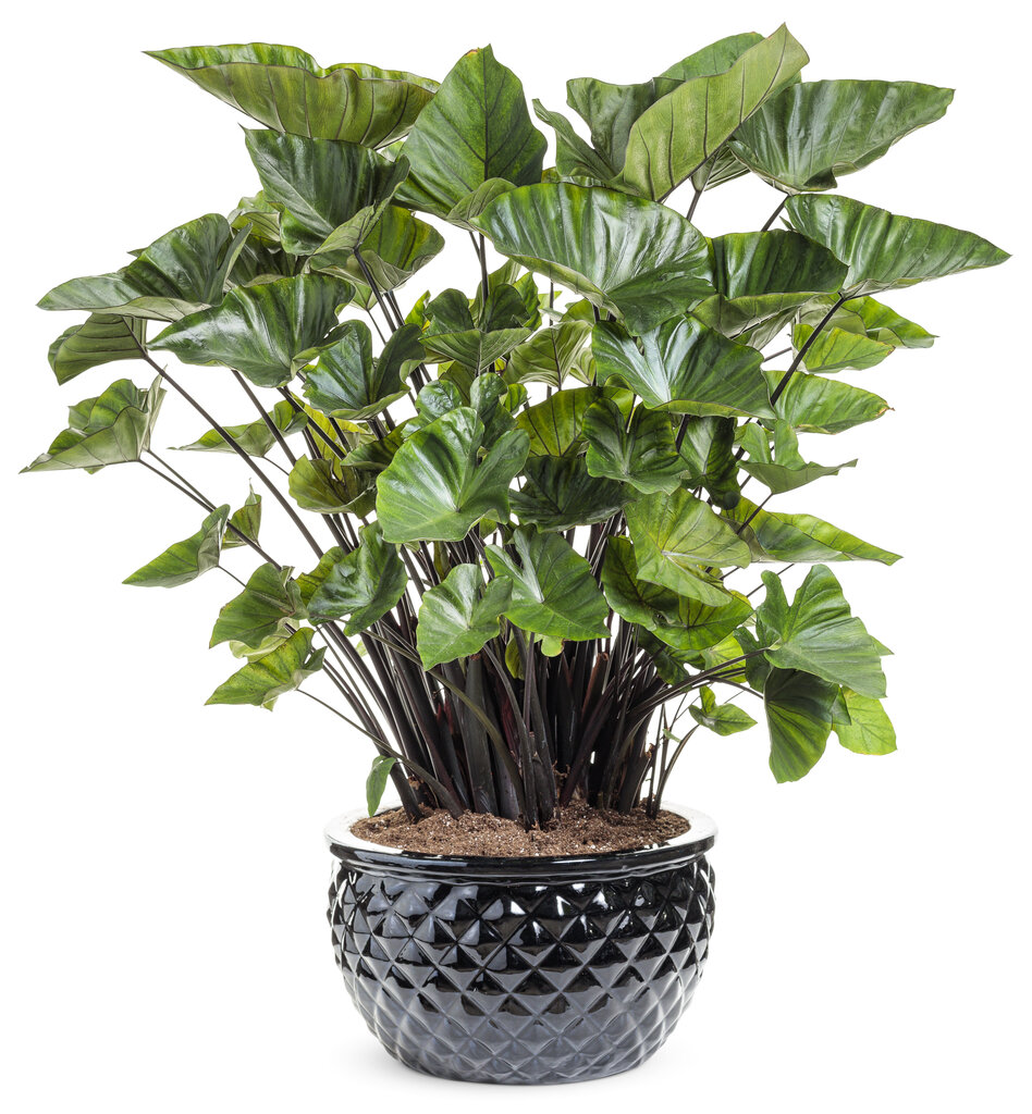 According to the Humane Society of America Colocasia plants can be toxic to pets. This is means that the plants are generally identified as having the capability for producing a toxic reaction. This plant is not edible and can be harmful to humans if ingested. These are durable plants that will perform best with moist to wet soil, but can tolerate some drought stress. Drought stress will negatively affect the appearance of the plant. Colocasia form tubers and these tubers can be stored for replanting in the spring. To dig and store tubers follow these directions. First, allow frost to kill the top of the plant then cut back the stems and dig the tubers. Wash off any soil and then allow the tubers to dry. Wrap dry tubers in newspapers or pack them in peat moss. Label each tuber or group of tubers so you know what they are come spring. Store tubers in a dark, cool (35 to 45 F) place. Do not allow tubers to freeze. |